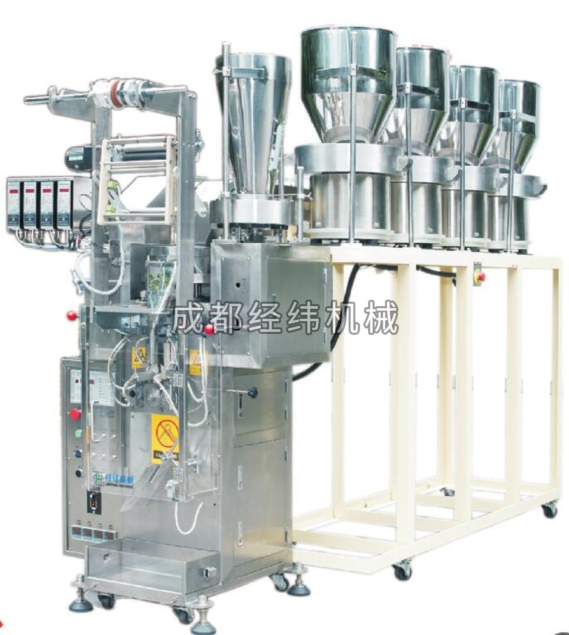 本機型為一種組合式自動包裝機系列,其制袋封口部件采用的是“夾板”形式;與“輥筒式”機型不同的是,該機型制袋-充填過程為間歇式運動過程。整體設備分為二部分,主機及供料部分;主機為標準的“夾板式粉末、顆粒包裝機”;“供料部分”為“多物料分別輸送-集中充填”結構。供料部分由振動推料盤、物料傳輸帶(裝置)和集料斗等構成,包裝時,可將多種粉料、顆粒料混合后一并裝入包裝袋中;可實現單包或連包的包裝。DX(X表示振動盤的數量)